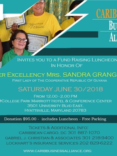 The Caribbean Business Alliance (CBA) of the Washington, D.C. metro area honored Her Excellency Sandra Granger for charitable networking with the "First Lady of Guyana Luncheon" on Saturday the 30th of June at the College Park Marriott Hotel & Conference Center in Hyattsville, Maryland.